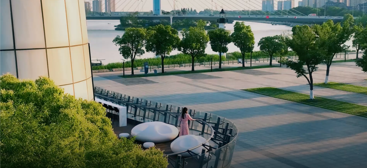建筑紧邻双运河水岸,整体以玻璃幕墙围合,形成水岸上的游轮造型。门前广场为市民提供漫步、会谈的场所,二楼露台布置云朵状座椅,在加强室内外联系的同时,生动诠释运河水岸人与自然和谐共处的生活场景。